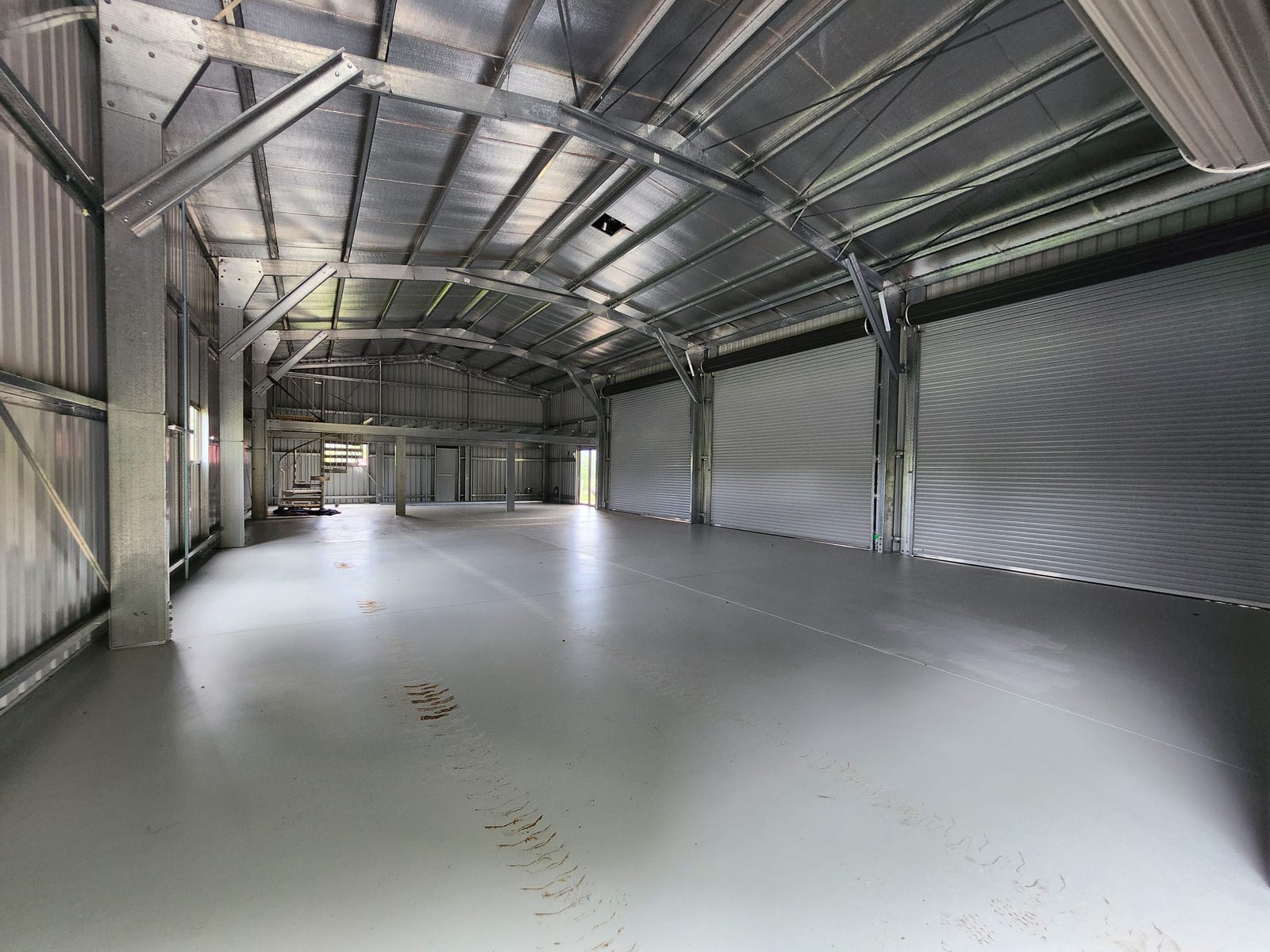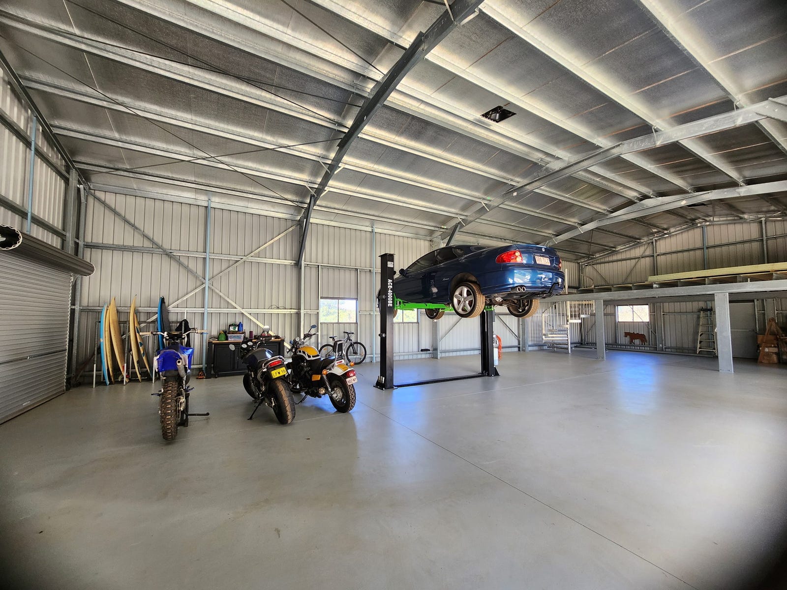 20m x 10m lockable machinery shed with concrete painted floor, mezzanine top level floor & spiral staircase with attached 20m x 6m carport for additional undercover parking